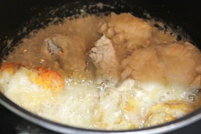 - Đổ nước luộc ghẹ vào, nấu sôi lửa nhỏ cho nấm mềm (nếu có trứng ghẹ bạn cho vào luôn). Sau khi nấm mềm bạn có đổ tiếp ít nước lạnh, đun sôi lên.